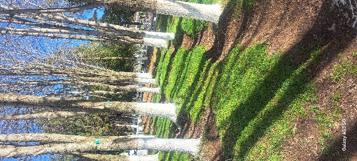 The image displays a treed landscape within the city of Angren, Uzbekistan, under a clear, bright blue sky. Multiple deciduous trees with light gray-brown bark stand in rows, their lower trunks painted white up to varying heights. The ground features bright green grass interspersed with areas of exposed brown soil, showing distinct patterns of growth and bare patches. Long, dark shadows are cast across the ground by the trees, indicating direct sunlight from a high angle. Many trees are bare-branched, while some in the distant background show green foliage. A small, rectangular green tag is affixed to the trunk of a tree on the left side of the frame. No human presence or activity is observed.