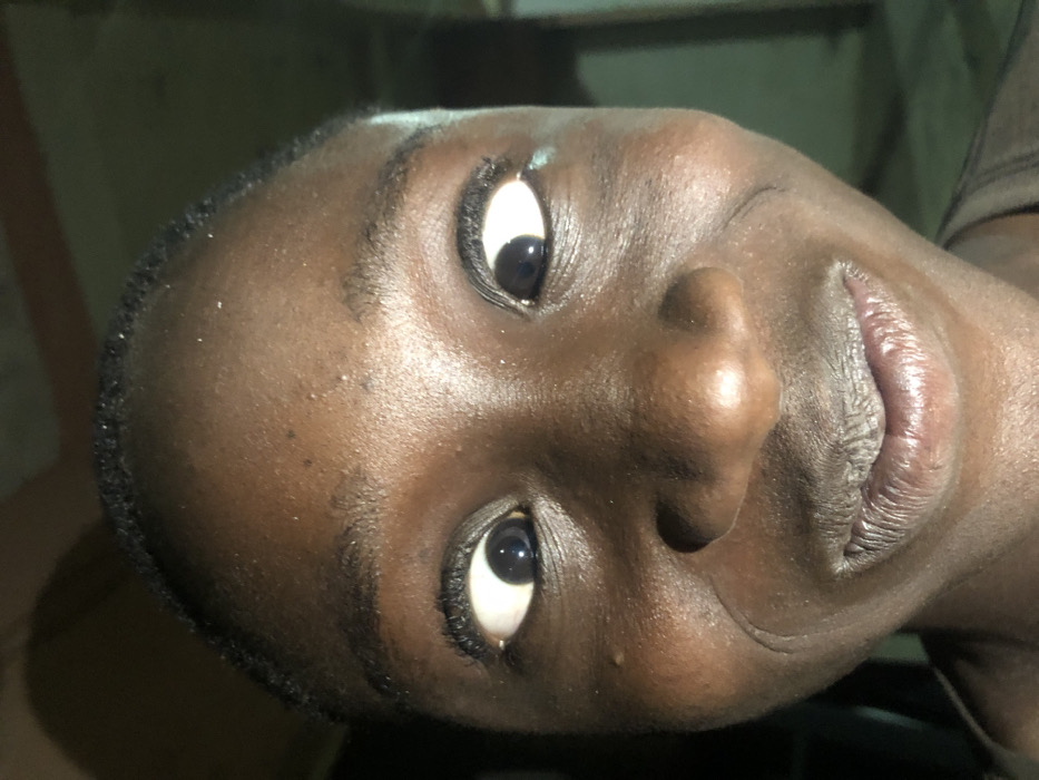 A close-up image of a Black person's face is presented, tilted towards the right. The focus emphasizes the nose, eyes, and lips. The skin appears smooth and has small, light-colored spots. Dark irises contrast sharply with the whites of the eyes. Lips are slightly parted, showing texture. The hair is closely cropped. Lighting highlights the forehead and nose, creating shadows on the cheeks and around the eyes.