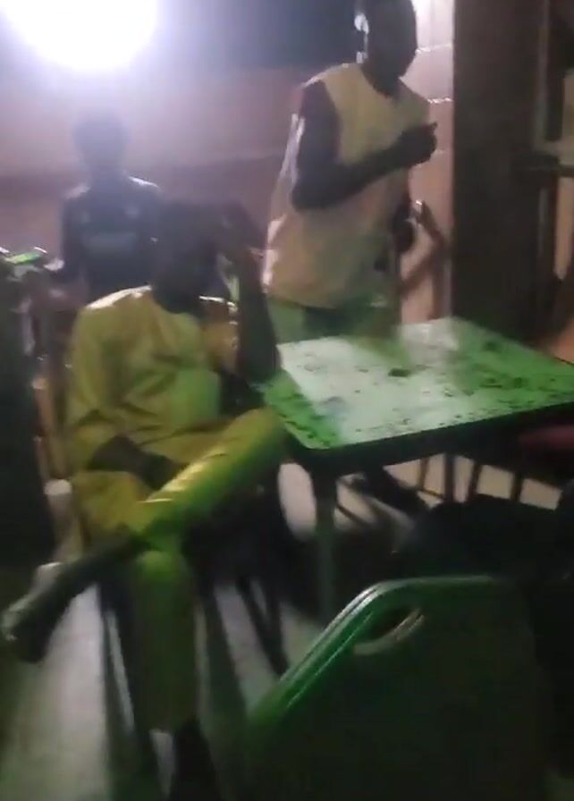 Three men are gathered around a small square table on an open-air porch. One man sits wearing a yellow, traditional-style outfit, looking down and holding a cigarette. Another man stands in a sleeveless, off-white shirt and gestures with his hands. A third man, wearing a black Real Madrid jersey, stands in the background. The table is painted green and has some smudges or spills on it. A bright, circular light shines overhead. The porch is tiled. Music plays in the background.