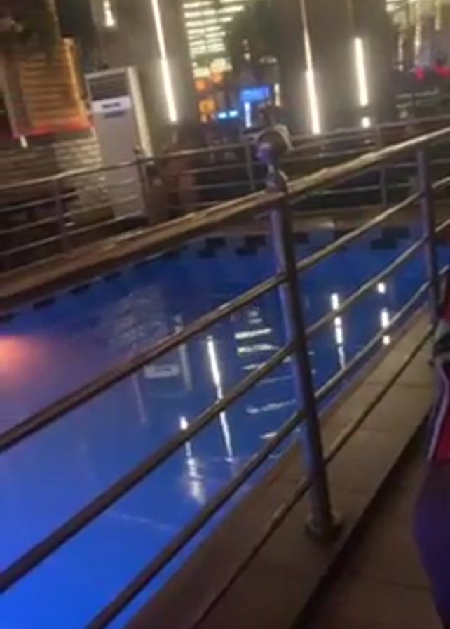 n elevated view of a small swimming pool. The pool is lit with bright blue lights. The pool is surrounded by a metal railing. The pool is inside a building, possibly a restaurant or bar. The walls are decorated with signs and lights. A person is visible on the right side of the frame. Music is playing in the background.