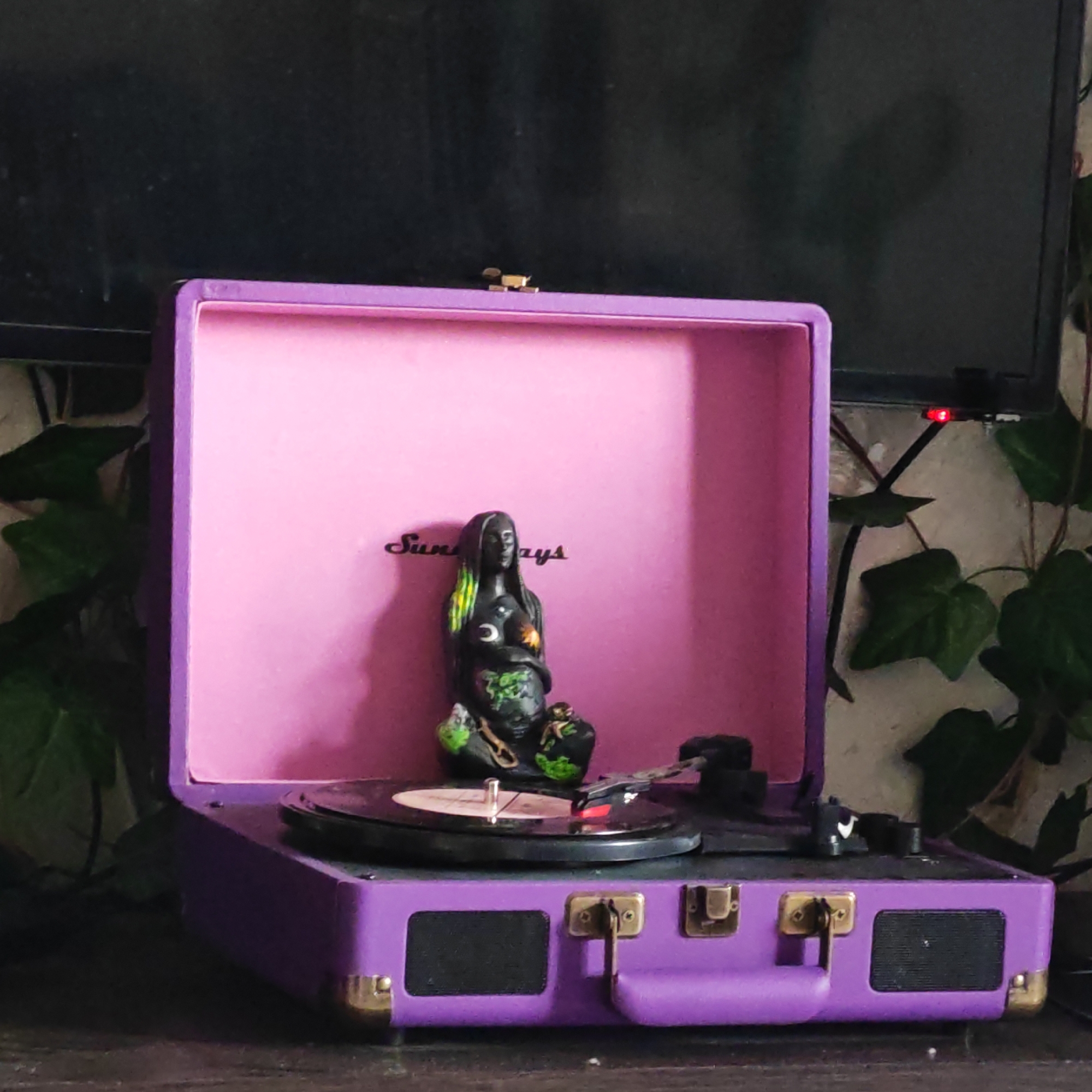 purple suitcase-style record player placed on a dark wooden surface. Inside the open record player, on the turntable, sits a dark-colored statue of a woman with painted details. The interior of the suitcase is light pink, with the word "Sundays" written across the top. Behind the record player, there is a television screen and some plants with green leaves. There is no information to suggest the image was taken in Novo-Nikol'skoe, Russia.