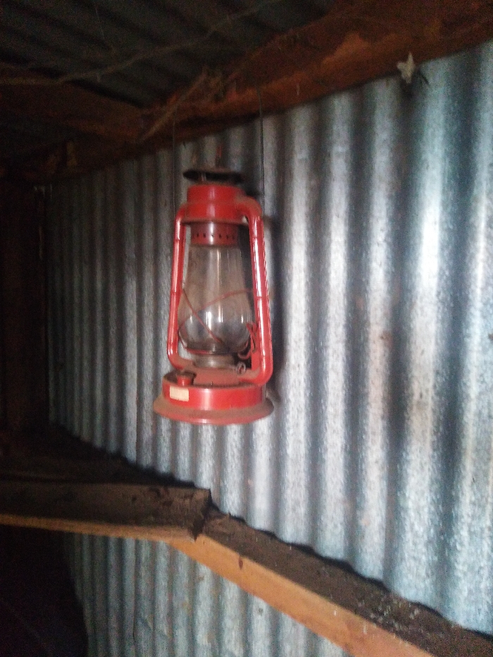 - "A red kerosene lantern hangs against a corrugated metal wall" by FM-15Ydd2, licensed under CC BY 4.0