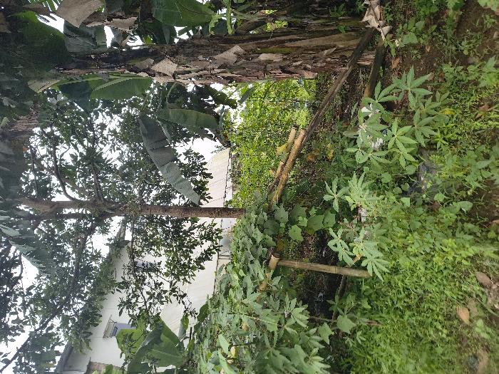 This image captures an overgrown outdoor scene in An Khe Ward, Vietnam, under an overcast sky. The foreground is dominated by dense green vegetation, including broad-leafed plants, grasses, and smaller shrubs. A makeshift trellis or support structure made of bamboo or light wooden poles is visible, partially obscured by climbing plants, extending from the left towards the center. In the midground, multiple trees are present. On the right, a banana tree with a textured, peeling trunk and large, partially torn green leaves stands prominently. Further left, a tall deciduous tree with a thick trunk and a full canopy of green foliage rises above the lower growth. The background reveals portions of residential buildings behind the vegetation. To the left, a section of a multi-story, white-painted building with a blue-framed window is visible. Towards the center-right, another structure with a corrugated, light-colored roof is discernible through the trees. No individuals, animals, or active human interactions are depicted. The scene presents an unmaintained or semi-wild area adjacent to residential development.
