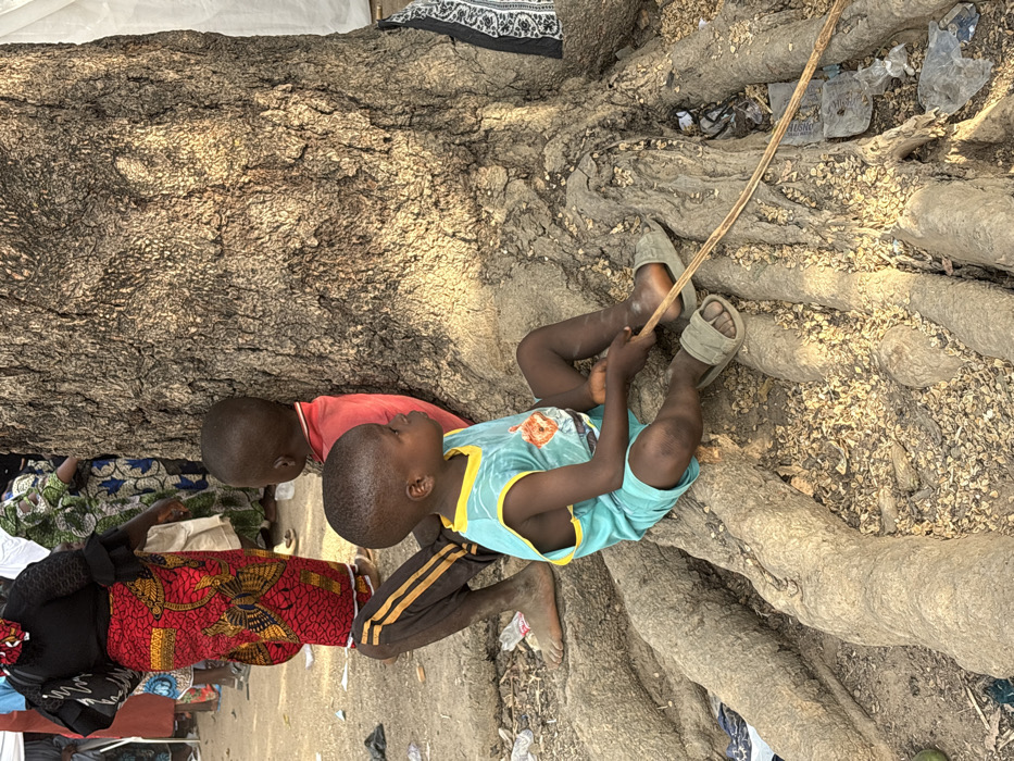 A large tree's roots surround two young children. One child lies against the trunk, wearing a red shirt and dark pants with gold stripes. The other child, in a teal tank top and sandals, sits among the roots, holding a thin stick. Adults in colorful patterned clothing stand nearby. Litter is scattered among the tree roots.