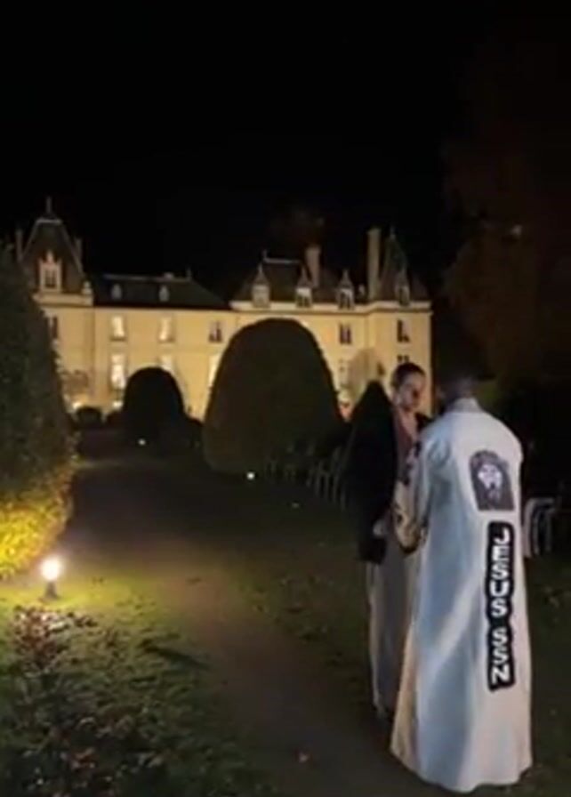 At night, a person in a long white coat with a depiction of Jesus and the word "JESUS" on the back stands in a garden in front of a large building that appears to be a mansion or castle. The person is conversing with someone. The scene is lit by small lights along a garden path. As the person in the coat walks away, more people can be seen standing in the garden. The man in the coat is wearing a large silver crucifix necklace.