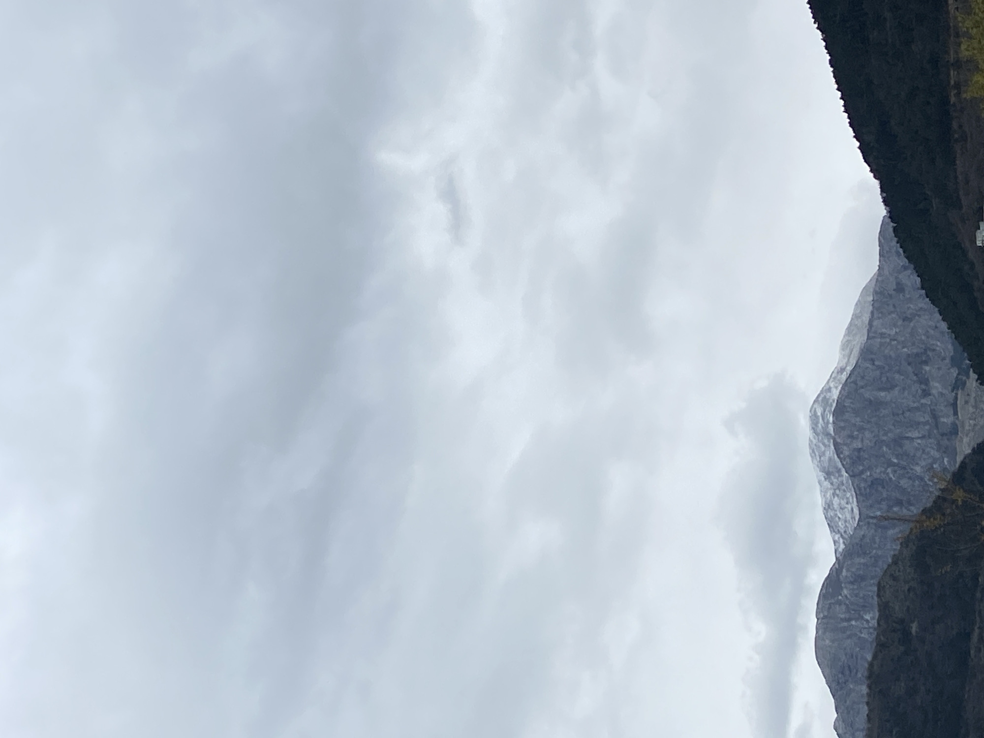 The image displays a mountainous landscape, likely viewed from the vicinity of the city of Dub, Montenegro. The upper two-thirds of the vertical frame are dominated by a uniform, overcast sky composed of light grey clouds. The lower third reveals a range of mountains. A prominent peak towards the center-right exhibits a visible layer of snow or frost on its upper slopes, appearing lighter grey. To its left, adjacent mountain peaks are dark grey and rocky. The far right side of the frame features a steep hillside densely covered with dark green or black coniferous trees, forming a distinct diagonal against the sky. The immediate foreground on the left contains indistinct dark terrain, possibly low hills or dense vegetation. No individuals, discernible man-made structures, or active movements are present in the scene.