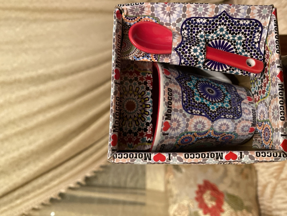 The image displays a souvenir gift set featuring a mug and a spoon, presented within its open cardboard packaging. The packaging and the ceramic mug are adorned with intricate, colorful geometric patterns characteristic of Moroccan zellige mosaics, utilizing shades of blue, teal, purple, beige, and white. The phrase "I ❤️ Morocco" is prominently and repeatedly printed on the box's exterior and on the surface of the mug. The mug features a red-lined rim. A solid red spoon, likely ceramic or durable plastic, is secured within a custom compartment in the box, positioned to the right of the mug. The spoon's handle includes a small, circular perforation at its end. The background is out-of-focus, revealing soft, vertically pleated beige or light brown fabric, possibly drapes or upholstery, filling the upper and central portions of the frame. A blurred corner of a cushion with a faint red floral pattern on a light background is partially visible in the lower left quadrant. No visual identifiers are present within the scene to determine a specific location within the city of Meknes, Morocco, or any other precise geographical point.