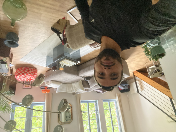 The image displays an indoor living space, identified as being in the city of Roubaix, France. A male subject, mid-20s to 30s, with a beard and a patterned headband, occupies the immediate foreground, facing the camera for a selfie. He wears a black long-sleeved shirt with a white Nike swoosh logo on the left chest. The room features wooden flooring and light-colored walls. To the left, a wooden staircase with a dark metal railing ascends. The far wall incorporates two large windows with light blue frames, admitting natural light and revealing green foliage outside. Furniture includes a large, light beige L-shaped sectional sofa with white throw pillows and a blanket. A cat is visible resting on the sofa's corner section. In front of the sofa, a dark glass coffee table rests on a light-colored, patterned area rug, holding a small white tray with decorative objects and two jars. A small, low side table with an orange mushroom-shaped lamp is positioned near the sofa. A large red and white checkered pouf is on the floor adjacent to the sofa. A tall, arching floor lamp with multiple chrome-finished, bell-shaped shades stands prominently on the right side of the frame. A large, light green glass demijohn and a blue ribbed pot are visible on the floor to the right. A rectangular mirror with a decorative frame is mounted on the wall between the two windows. A green potted plant sits on a clear glass table in the foreground left.