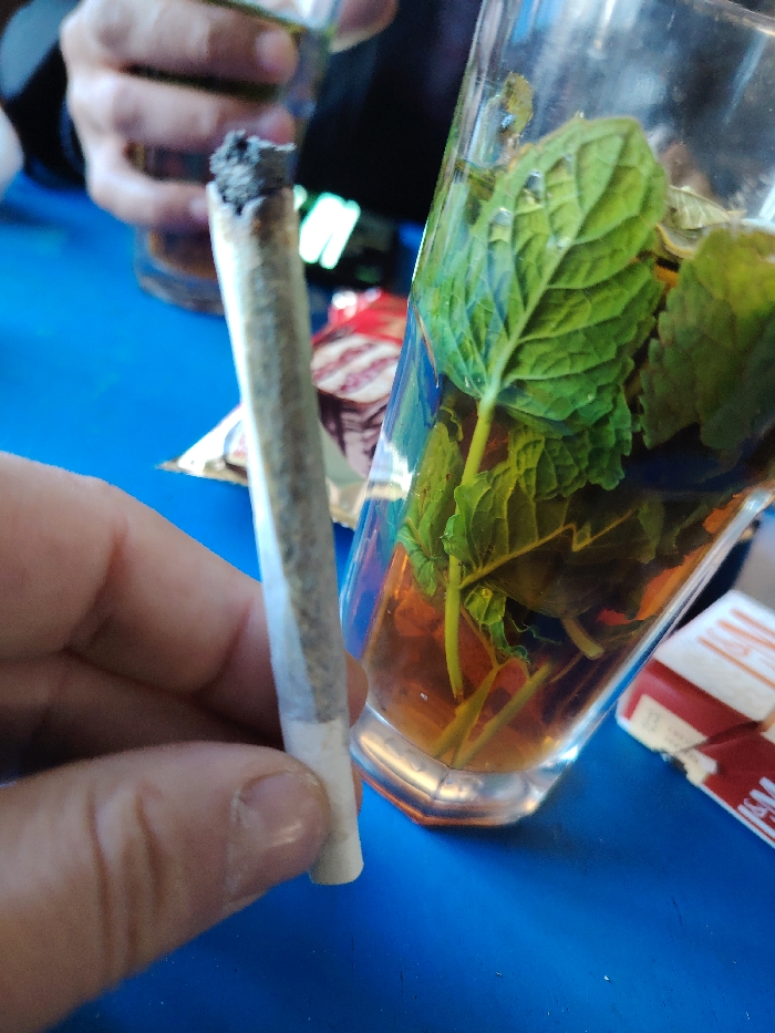 A hand holds a lit, rolled cigarette near a glass of amber liquid with green mint leaves