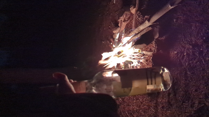 The image displays an outdoor night scene featuring a ground-level campfire. The precise location within Modi'in-Maccabim-Re'ut, Israel, cannot be determined from the visual evidence; however, the environment consists of dark, loose earth covered with organic debris, consistent with a natural area such as a forest or unpaved clearing. In the left foreground, a human hand with a light skin tone is observed holding a clear glass bottle by its neck. The bottle contains a pale, translucent liquid and appears approximately two-thirds full. An illegible label is affixed to the bottle's body. The central subject is a brightly burning campfire, composed of multiple logs and smaller pieces of wood. Flames, predominantly yellow and orange, emanate intensely from the burning material. Scattered around the campfire are additional unburnt logs, branches, and several small stones. The immediate ground around the fire and under the bottle is illuminated by the flames, revealing reddish-brown soil and organic matter. The background is obscured by pervasive darkness, with no discernible structures or distant light sources. The campfire serves as the sole significant light source within the frame.