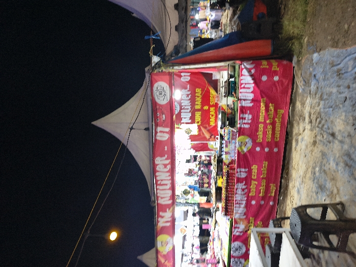 The image captures a nighttime scene within a food market located in An Khe Ward, Vietnam. The primary subject is a brightly lit food stall operating under a prominent white, pointed tent structure. A large red banner spans the front of the stall, displaying "TM. KULINER - 01," with offerings like "CUMI BAKAR" (Grilled Squid) and "MACAM SIUP." The lower part of the banner lists specific food items including "baby crab," "bakso baku" (original meatballs), "bakso mercon" (spicy meatballs), "sosis bakar" (grilled sausage), and "corondog" (corn dog). The stall's counter is heavily occupied with numerous transparent containers holding various prepared foods, alongside bottles of beverages, a weighing scale, and visible cooking apparatus. One individual, dressed in dark attire, is partially visible behind the counter, obscured by the food items, presumably attending to the stall. To the left in the foreground, a light-colored, table-like structure is present with two dark plastic stools on the unpaved, earthy ground. The dark night sky serves as the backdrop, with a single yellow light bulb suspended by wires in the upper left. Additional white-tented stalls, also illuminated, are visible to the left and right in the background, indicating a larger market setting.