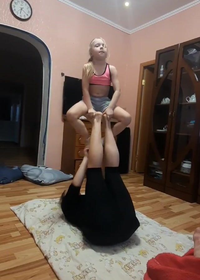A girl in a pink top and gray shorts sits on the feet of a woman lying on her back on a blanket in a living room. The woman is wearing black leggings. The girl is balancing on the woman's feet, which are held in the air. A clock on the wall reads 9:06. The living room has wood floors, light pink walls, and an archway. A cabinet and a TV stand are also visible in the room.