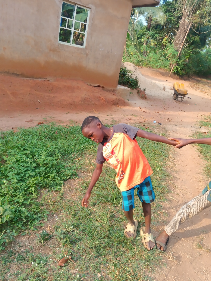 The scene depicts an outdoor environment in Eziudo, Nigeria, characterized by unpaved ground, structures, and vegetation under bright daylight. In the foreground, a young male individual with dark skin, wearing a dark grey t-shirt layered over an orange graphic t-shirt, blue and black plaid shorts, and light-colored slip-on sandals, leans forward and downwards. His right arm is extended towards a small, brown, elongated object on the ground amidst green foliage and small white flowers. His left hand is clasped with the right hand of a second, partially visible individual in the lower right frame, who wears light-colored striped trousers and a dark slip-on sandal. The ground consists of reddish-brown earth pathways and patches of dense green groundcover. In the mid-ground, a single-story, light brown plastered building with a white-framed window reflecting the sky and greenery is visible to the left. To the right of the building, a dirt path extends into the background, where a small pile of sand is present. Further along the path, a yellow wheelbarrow containing two yellow jerrycans is visible. The far background features lush green tropical trees and dense foliage.