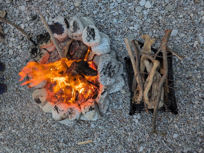 An overhead view captures an active campfire on a gravel surface in Prijevor, Montenegro