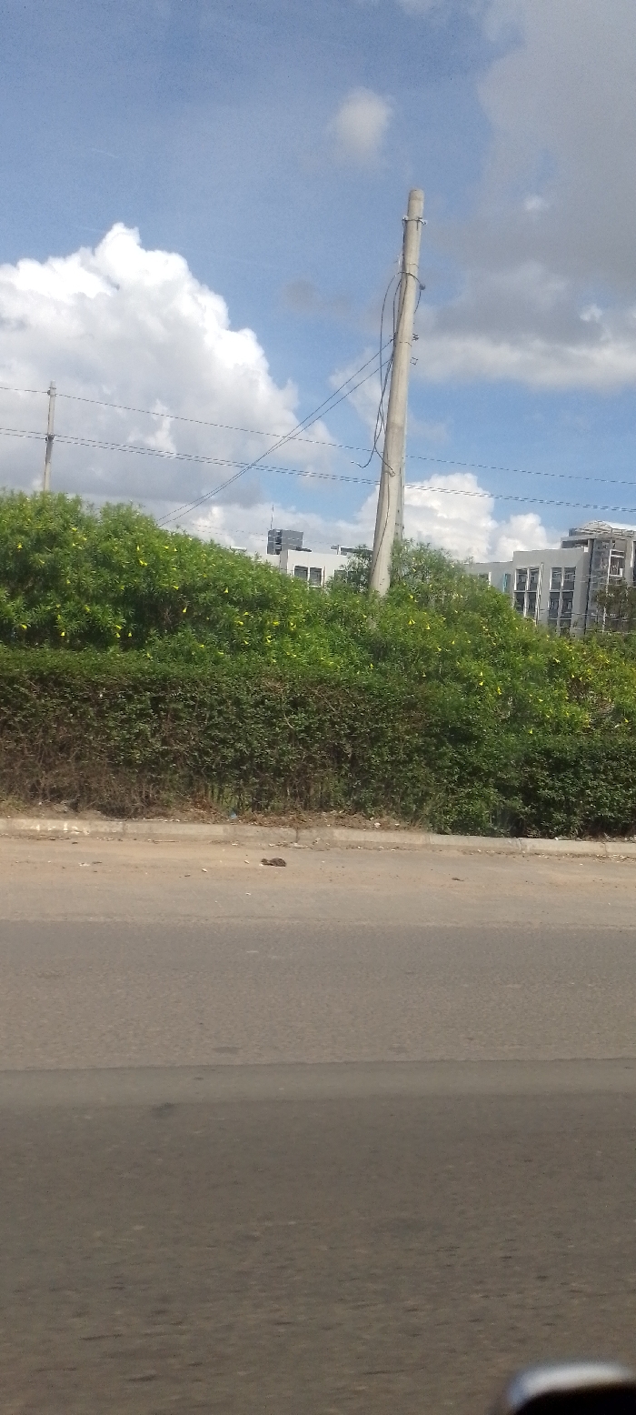 The image displays an exterior scene in Matathani ward, Kenya, under a partially cloudy blue sky featuring both white cumulus and darker grey clouds. In the foreground, a grey asphalt road occupies the lower portion of the frame. It is bordered by a concrete curb, beyond which lies a strip of dirt and scattered debris. Above this, a dense horizontal band of dark green, trimmed shrubbery is visible, topped by taller, lighter green foliage studded with numerous small yellow flowers. Two utility poles are present: a prominent, light-grey concrete pole stands vertically on the right, supporting multiple horizontal wires. A thinner, darker utility pole is partially visible on the far left, also with wires attached. In the background, behind the vegetation and utility infrastructure, several multi-story buildings with light-colored facades and dark window sections are discernible. No human figures are visible. A dark, curvilinear object, consistent with a vehicle's interior component, is present in the bottom right corner.