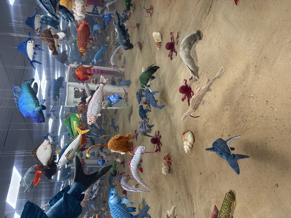 This image depicts an immersive art installation located within a contemporary art or design museum in Tel Aviv, Israel. The scene simulates an underwater environment, featuring numerous plush marine creatures suspended at various heights and resting on a sand-covered floor. The floor is covered with light-brown, granular material resembling sand. The walls are composed of highly reflective mirrored surfaces, which create an illusion of infinite depth and multiply the visible elements throughout the space. Overhead, rectangular light fixtures are visible as reflections on the mirrored surfaces. Numerous plush fabric sea creatures are the primary subjects. Suspended by thin, almost invisible wires, various types of fish are visible, including a large blue and green parrotfish-like figure, a multi-spotted fish, a yellowfin tuna-like fish, red fish, dark blue fish, and a prominent dark fish tail in the upper-left. On the sand-covered floor, several reddish-brown plush octopi, light-colored plush conch shells, hermit crabs, a grey dolphin-like figure, a beige sawfish-like figure with a long rostrum, a dark blue shark-like figure, and a long white and pink serpentine fish/eel-like figure are arranged. The reflection of a single individual, likely a visitor, is visible in the upper-mid right section of the mirrored wall, showing their head and shoulders with dark hair. In the same reflective area, a white door frame and a large black graphic depicting a coffee cup are discernible on an adjacent wall, providing additional environmental context suggestive of a specific themed exhibit or museum section. All depicted subjects are static, part of a fixed installation, with no active movements or direct interactions observed.