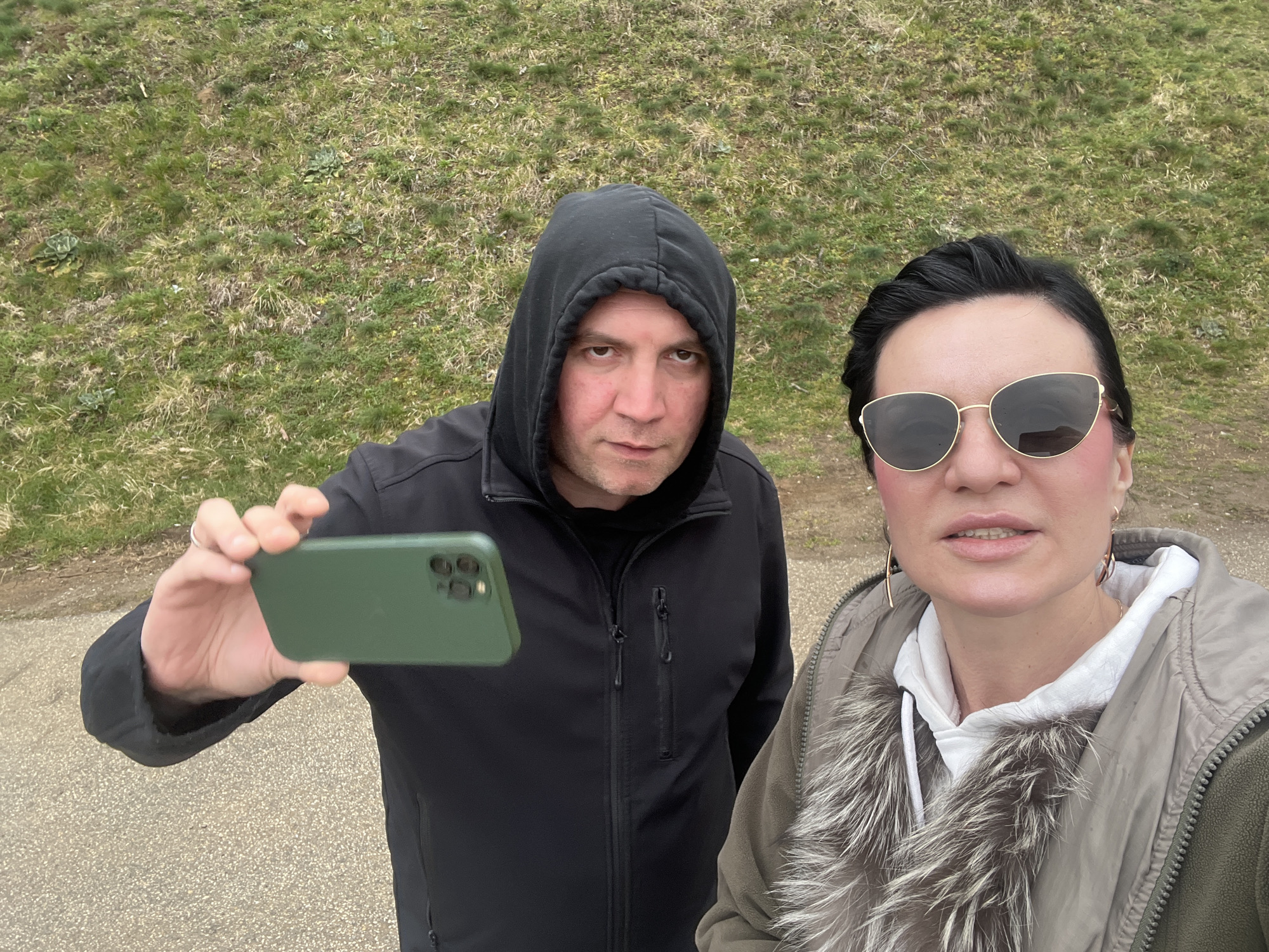Two individuals are captured in a close-up, waist-up selfie-style photograph within Despotovac Municipality, Serbia. The scene depicts a male subject on the left, wearing a black hooded jacket with the hood raised and a black undershirt. He has light skin and a neutral expression, looking directly at the camera. His right hand, adorned with a silver-colored ring on the fourth finger, holds a green smartphone horizontally, angled towards the viewer, suggesting he is operating the device to capture the image. To his right stands a female subject with dark hair pulled back, wearing gold-framed cat-eye sunglasses with dark lenses, a white hooded sweatshirt, and an olive-green puffer jacket featuring a prominent multi-toned faux fur collar. She displays gold-colored hoop earrings and a slight pink blush on her cheeks, with her mouth slightly open, also looking towards the camera. The background consists of a gently sloped, partially green and partially dry grassy area with scattered broad-leafed plants. The immediate foreground shows a light grey paved surface, appearing somewhat damp. The lighting is diffuse, indicative of an overcast day.