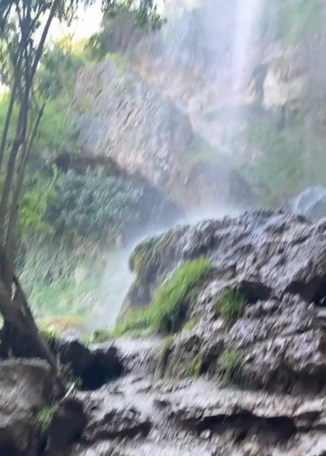 waterfall cascading over mossy rocks and a rocky ledge in a forest environment. The camera begins at a low angle, focusing on the wet, rocky terrain before tilting upwards to reveal the full height of the waterfall. The water falls from a rocky overhang covered in greenery and trailing vines. The sky is visible through tree branches at the top of the frame. The environment is lush with vegetation, and the air appears misty due to the waterfall's spray. The scene is naturally lit, with sunlight filtering through the trees.
