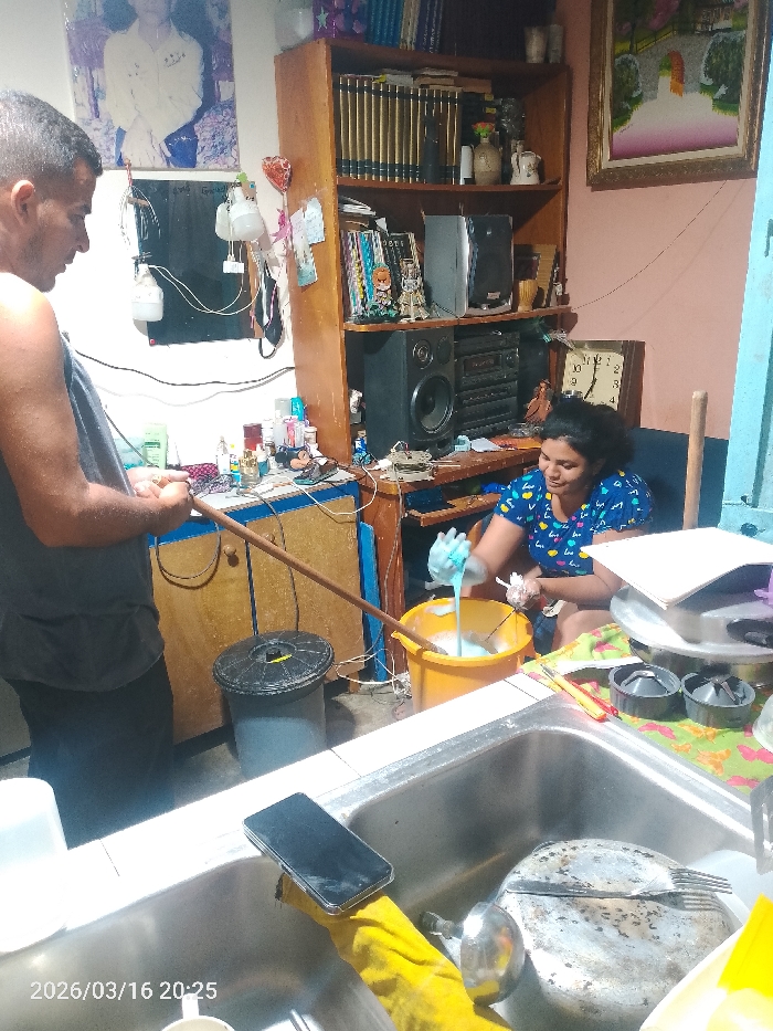 This image depicts an indoor domestic scene in Las Tejerías, Venezuela, captured on 2026/03/16 at 20:25. In the foreground, a stainless steel kitchen sink contains dirty dishes, including a pot, a ladle, and a fork. A black smartphone rests on a yellow fabric next to the sink. To the left, a man wearing a grey tank top is partially visible, holding a wooden stick that extends towards a yellow bucket. To the right, a woman, seated and wearing a blue patterned top, is actively mixing a light blue, frothy substance within the yellow bucket with her hands, which are immersed in the mixture. A second wooden stick is also present in the bucket. A dark grey lidded bin is positioned between the man and the bucket. The background reveals a cluttered living space. A wooden two-door cabinet is situated beneath a desk holding various bottles, a small fan, and other miscellaneous items. A wall displays a framed portrait of two individuals in military-style uniforms, a small television screen with visible wiring, and two hanging compact fluorescent light bulbs. To the right, a tall wooden bookshelf is filled with books, decorative items including figurines and vases, and a stereo system with speakers. Further right, a large wall clock with Roman numerals and another framed picture are visible. The walls are painted white and a light pink.