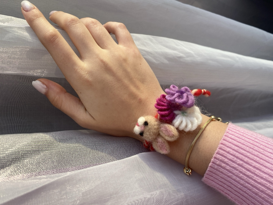 A human left hand and lower forearm are depicted in close-up, illuminated by natural light, against a background of sheer, light-colored curtains. The location is specified as Varna, Bulgaria. The subject wears a pink, ribbed long-sleeved garment on the forearm. The hand exhibits light-colored nail polish. Two bracelets are visible on the wrist and lower forearm. The first is a thin, gold-colored chain bracelet with spherical golden beads. The second, positioned above the first, is a decorative bracelet consistent with a traditional Bulgarian martenitsa. This bracelet comprises needle-felted elements: a light brown bunny figure with pink ears, black eyes, and a white/pink striped head ribbon; a magenta floral form; a purple floral form; and a white floral form with a light green center. The components are interconnected by red and white yarn, with a red and white striped cylindrical element hanging from the bracelet. The background curtains display vertical folds and are softly diffused.