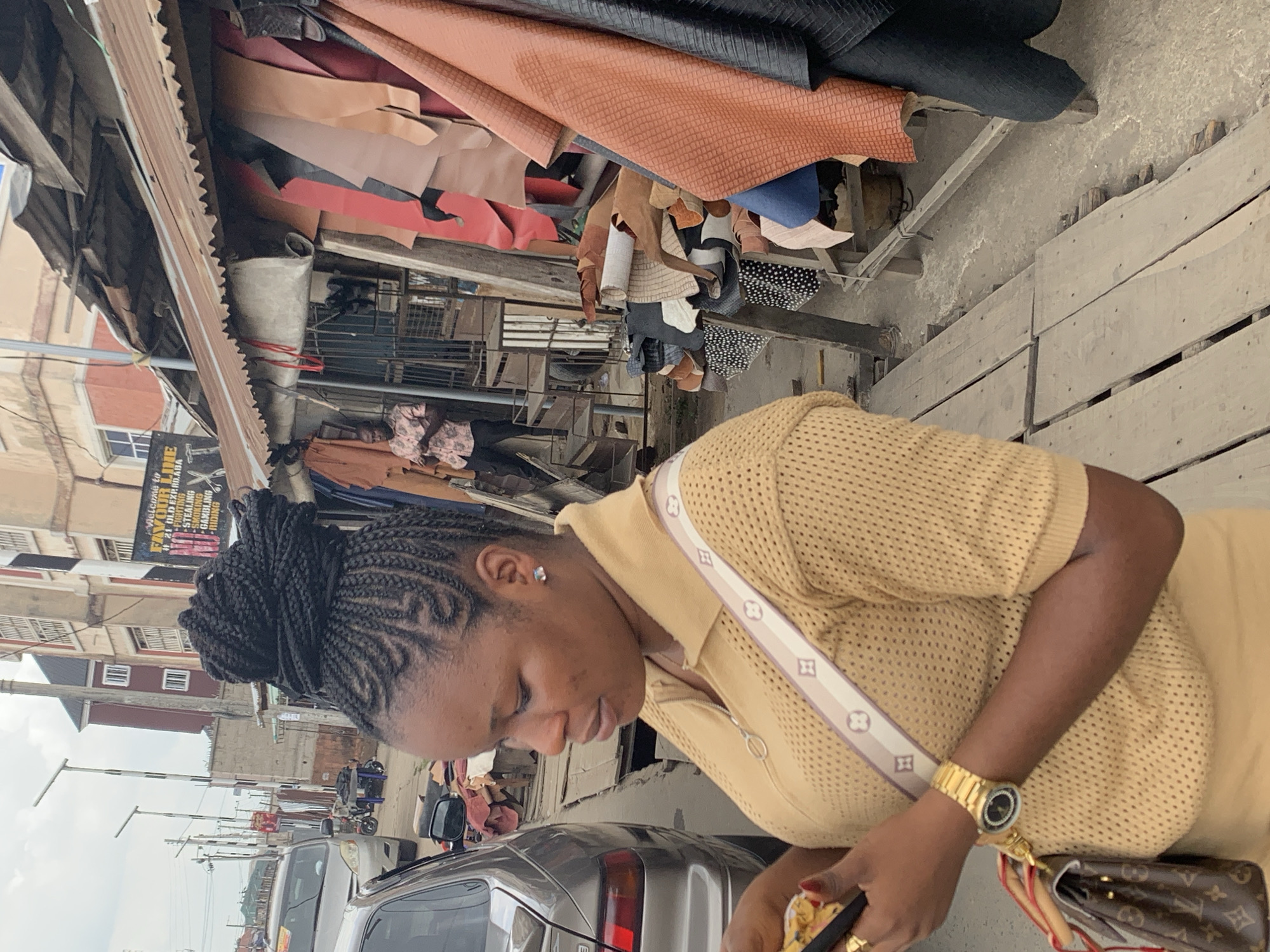 This image captures an outdoor street scene in Aba, Nigeria, specifically near "H. 21 Old Expand." The foreground is dominated by the left profile of an adult female, focused on a gold-cased smartphone held in her hands. She wears a light gold perforated knit short-sleeved polo shirt, a gold-toned watch on her left wrist, and carries a brown monogrammed shoulder bag with a light-colored patterned strap. Her hair is styled in dark braids, arranged in a high bun with intricate cornrow patterns on the visible scalp. She has a single clear stud earring in her left ear. To the subject's left, the rear quarter of a silver sedan is visible. In the midground to the right, a market stall, partially covered by a corrugated metal roof, displays numerous rolls and sheets of leather or fabric materials in various colors (red, black, brown, beige, blue) and textures, hanging and stacked. An adult male in a patterned shirt and dark trousers is visible standing inside this stall. A sign above the stall entrance reads "WELCOME TO FAVOUR LIB. H. 21 OLD EXPAND.ABA" and lists services such as "FIGHTING," "STEALING," "SMOKING," "GAMBLING," and "RIDING," accompanied by a scissors graphic. The ground comprises a concrete surface and an elevated wooden plank walkway in front of the market stall. The background reveals additional multi-story buildings, utility poles, overhead electrical wires, and more vehicles along a street under an overcast sky.