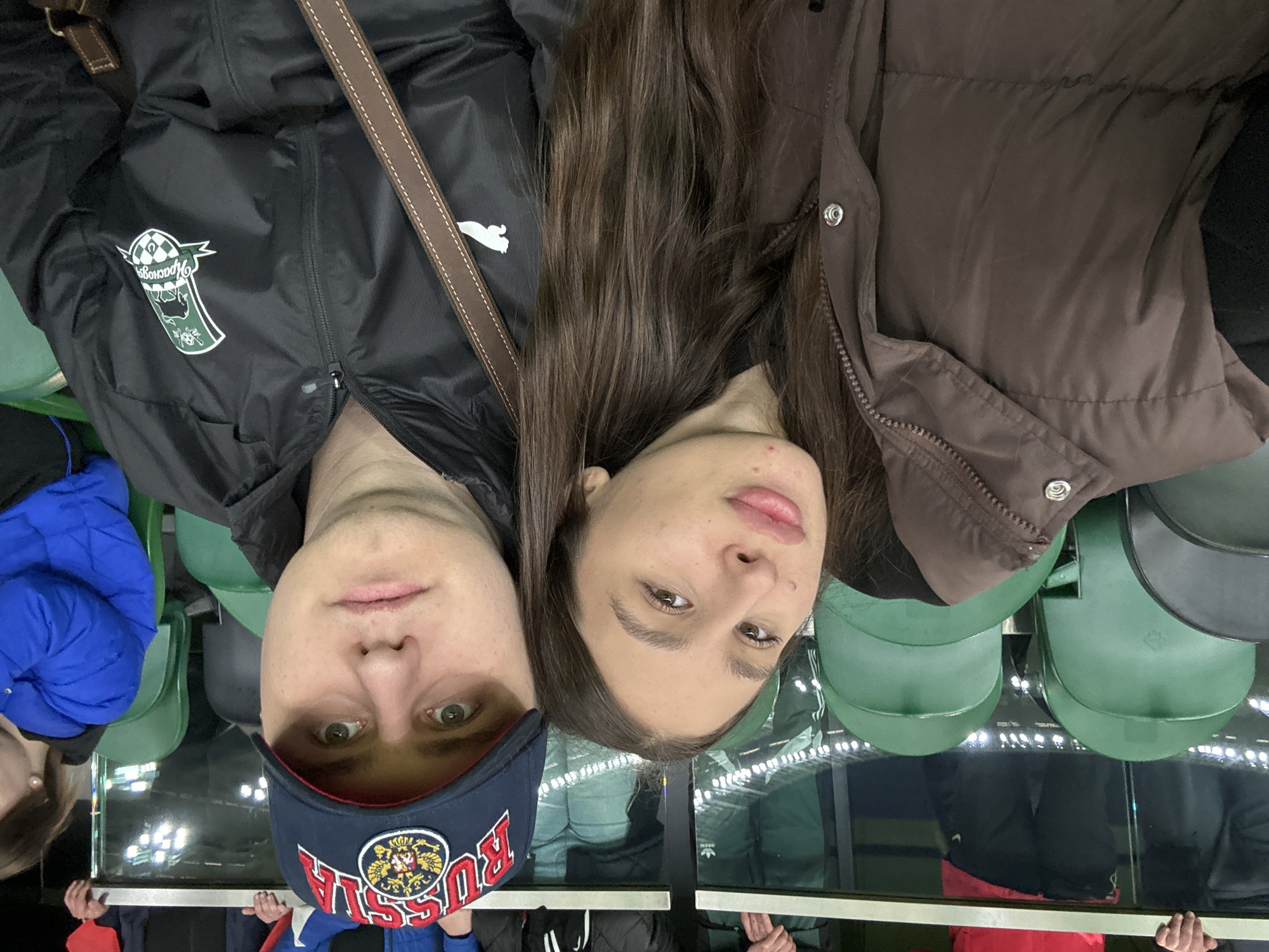 An image captures a female and male, appearing to be a couple, seated in the stands of the FC Krasnodar Stadium in Krasnodar, Russia, during what appears to be an evening sporting event. The female, approximately 20-30 years old with long dark brown hair, is positioned on the left, wearing a dark brown puffer vest. She leans against the male's left shoulder, looking towards the camera with a slight pout. The male, approximately 20-35 years old, is on the right, wearing a dark blue baseball cap embroidered with "RUSSIA" and the Russian national emblem, and a black windbreaker jacket featuring the FC Krasnodar logo on the left chest and a white Puma logo. A brown leather strap of a shoulder bag crosses his chest. He looks directly at the camera with a neutral expression. Green stadium seating is visible behind and around the individuals, with some seats occupied by other blurred spectators. Distant stadium lights are visible in the background, past a transparent barrier.