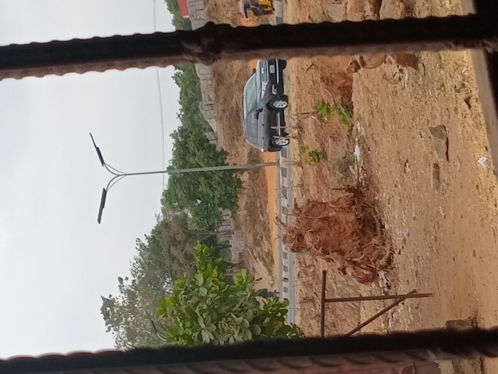The scene is an outdoor, daytime view in Dam Camp, Nigeria, partially framed by two vertical, dark, textured bars in the immediate foreground. The ground is primarily reddish-brown dirt, interspersed with small stones and scattered white debris. A large, irregular mass of brown, fibrous material, resembling an upturned tree stump or root system, rests on the dirt in the mid-left. To its left, a partial frame constructed from dark metal bars is visible. A paved asphalt road with a black and white striped curb or median runs horizontally across the midground. A dark-colored SUV, consistent with a Toyota Highlander, is present on the far side of this road, positioned towards the right. A single individual on a motorcycle is faintly visible on the road in the distant left. Beyond the road, an earthen embankment rises. A tall, gray street light pole, equipped with two horizontal solar-powered light fixtures, stands prominently on this embankment. In the background, numerous grey concrete blocks are stacked in rows, suggesting a construction or material storage site. Varied green trees with dense foliage are scattered across the landscape. The sky is uniformly overcast and light gray.
