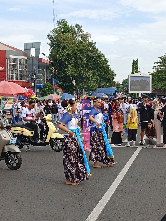 Two women in traditional Indonesian dance attire, featuring batik skirts, white corsets, and blue accents, perform barefoot on a street. A white line divides the asphalt beneath their feet. A crowd watches, with scooters and an advertisement visible in the foreground. The scene unfolds against a backdrop of buildings and a large tree, under an overcast sky.