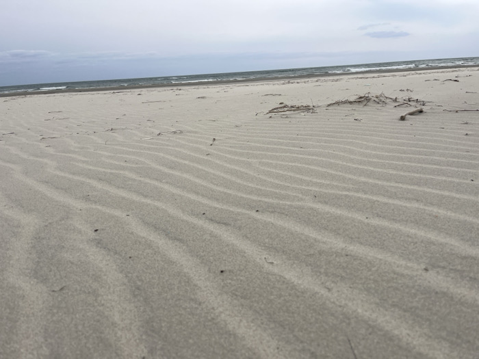 The scene depicts a desolate sandy beach in the city of Unknown, Greece, under an overcast sky. The foreground and midground are dominated by light beige sand, exhibiting distinct parallel ripple patterns likely formed by wind or water. Scattered across the sand, particularly in the mid-ground right, are small pieces of dry wood or vegetation forming a minor accumulation. The horizon line is clear, separating the sandy beach from the grey-blue sea, where moderate waves are visible. The sky above the sea is a uniform light grey, with subtle variations indicating cloud cover. No individuals, animals, or man-made structures are present in the frame, and no actions or interactions are occurring. The lighting is diffused and uniform, consistent with an overcast environment.