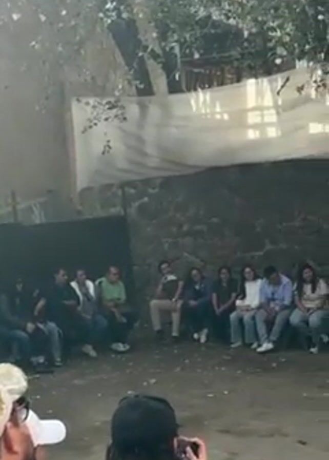 n outdoor performance with an audience seated in front of a stone wall. A man dressed in a green robe and a crown is performing for the audience. He walks back and forth, gesturing with his arms. A white awning provides some shade. Some of the audience members are clapping. Trees are visible above the wall, casting shadows on the scene. A person in the foreground appears to be filming the performance.