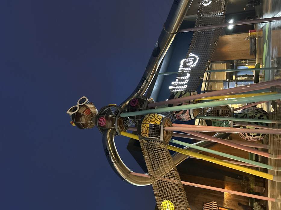 A tall, quirky outdoor art installation featuring a figure with a spherical head wearing white sunglasses. Its body is constructed from interconnected wireframe spheres and colorful rods. The figure is positioned against a dark blue evening sky. In the background, a building with illuminated lettering is visible, along with other architectural elements, suggesting an urban setting. The artwork's unique style and materials create a whimsical and eye-catching display.