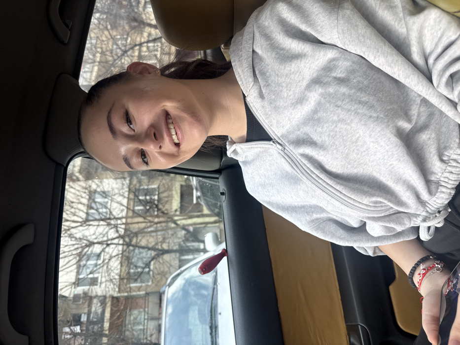 A young adult female is depicted seated in the front passenger seat of a vehicle, within a residential area of Sofia, Bulgaria. She has dark hair styled in a ponytail, a fair complexion, and is smiling at the viewer. Her attire consists of a light grey zippered hoodie worn over a black undergarment. On her left wrist, she wears multiple bracelets, including red string bracelets and a dark braided one. Her left hand holds a dark-colored smartphone. Through the vehicle's window, the background reveals multi-story residential buildings with numerous windows, partially obscured by leafless trees, suggesting a cooler season. A silver-colored vehicle is parked in front of the subject's car, and a distinctive red, fish-shaped object is visible on its dashboard or lower windshield. Additional vehicles are parked along the street further in the background.