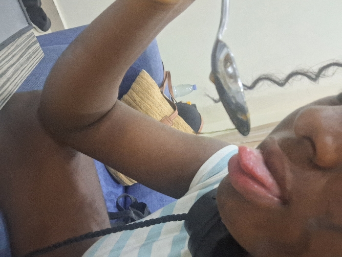 The scene is an interior setting in Close, Nigeria, depicting a partial view of an individual with dark skin. The person is seated or reclining on a blue upholstered sofa. Their right arm is bent, holding a silver-colored spoon containing a dark, viscous substance, which is positioned directly in front of their face. The person's tongue is extended from their mouth towards the spoon. They are wearing a light-colored, horizontally striped shirt, and black headphones are visible around their neck. A single, dark, curly strand of hair hangs near the person's face on the left. In the background, on the sofa, a woven, light-brown bag or pillow is visible, along with a clear plastic water bottle. The wall behind is plain and light-colored. On the floor to the lower left, a pair of black slip-on shoes are present, next to a surface with a striped, light-colored pattern.
