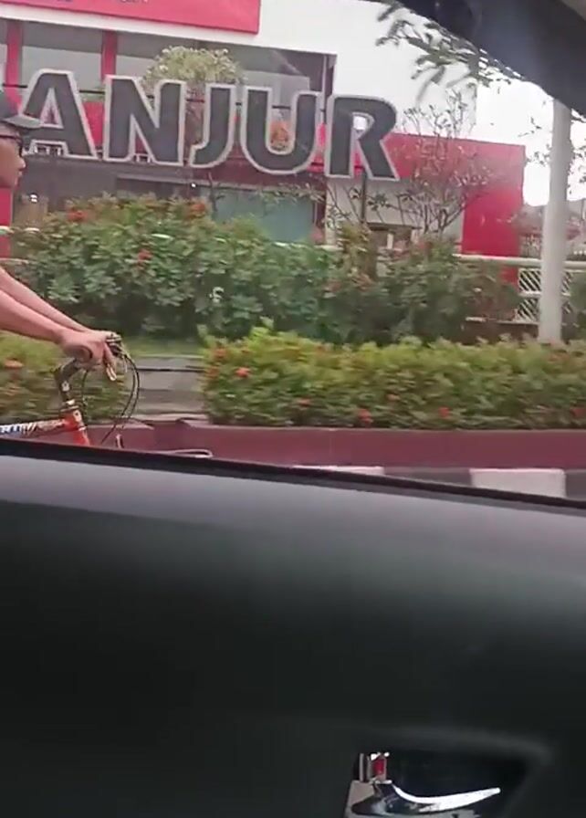 The video, recorded from inside a moving vehicle, shows a man riding a bicycle on a road