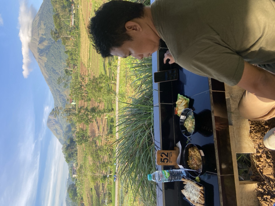 An outdoor scene depicts an adult male seated at a black tiled counter, overlooking a mountainous landscape in Penanggungan, Indonesia, under a bright blue sky with scattered white clouds