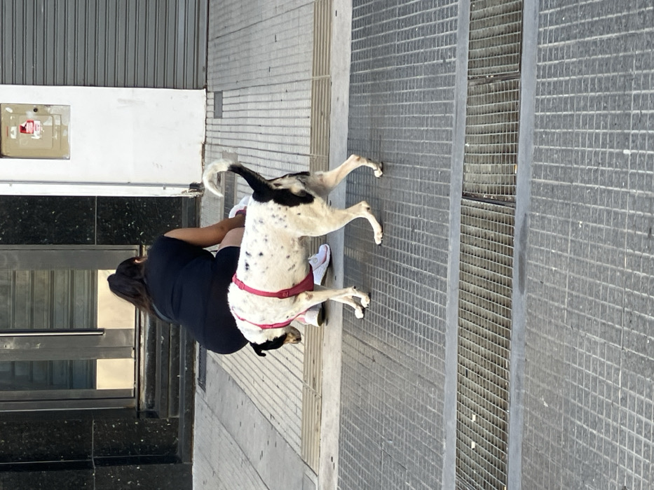 A person is depicted crouching on a sidewalk in Quilmes, Argentina, viewed from behind. The individual wears a black sleeveless top, dark shorts, and white athletic shoes, with dark hair tied in a ponytail. Their hands are positioned low towards the ground, near their feet. A white dog with irregular black spots, wearing a pink harness, walks towards the left foreground, away from the person. Its head is lowered, and its tail is curled. The ground consists of light-colored sidewalk tiles near the person, transitioning to sections of rectangular metal grate flooring in the foreground. In the background, a building facade is visible, featuring a dark, possibly granite, section with a glass door to the left, and a light-colored wall with a utility box and a closed metal roll-down shutter to the right.