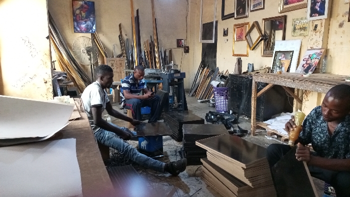 Inside a utilitarian workshop in Sardauna, Nigeria, three adult males are engaged in activities. The environment is characterized by beige-colored walls displaying wear, with numerous framed pictures and empty frames of various sizes and styles hanging on the right wall, alongside an abstract painting and a white industrial fan on the left. In the left foreground, a male individual wearing a white t-shirt with dark sleeves and dark blue jeans is seated, observing a dark, rectangular flat object he holds with both hands. His left foot is visible on the floor. To his right, in the mid-ground, another male, wearing a blue and white striped polo shirt and dark trousers, is seated on a blue plastic crate, looking down and interacting with a smartphone held in his hands. Behind him stands a piece of industrial machinery, possibly a frame joiner or cutter. On the right side of the image, in the foreground, a third male, dressed in a dark patterned shirt and dark trousers, is seated on the floor. He holds a translucent yellow plastic bottle, from which he dispenses a yellow-orange liquid (presumably adhesive) onto the edge of a dark, rectangular wooden or composite board. To his left, stacks of similar dark boards are neatly piled on the floor. The background along the left and center walls features numerous long, slender pieces of framing material, varying in color from gold to black, stacked vertically. A rustic wooden table or workbench is positioned on the far right, with a purple plastic crate beneath it. A large, light-colored sheet of material, possibly foam core or matboard, is visible on a surface in the immediate left foreground.