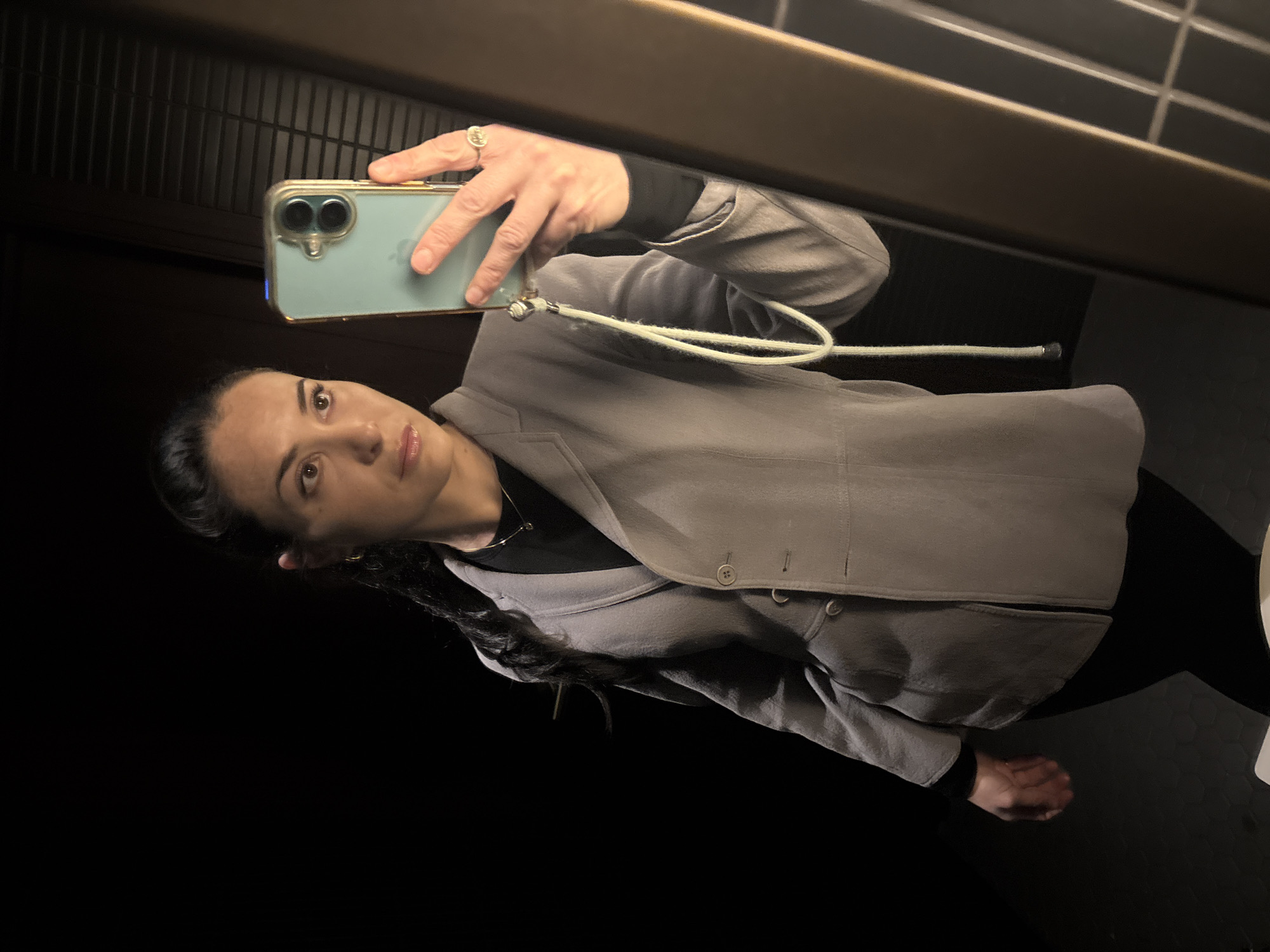 A person is taking a selfie in what appears to be a restroom, judging by the visible tiling and bathroom fixtures in the background. The individual is holding a light blue smartphone with a protective case, showcasing the rear camera. The person is wearing a gray, collared shirt or jacket and dark-colored clothing underneath. The lighting seems dim, emphasizing the person and the immediate foreground while obscuring the details of the surroundings. The location in London, United Kingdom, cannot be determined from the image.