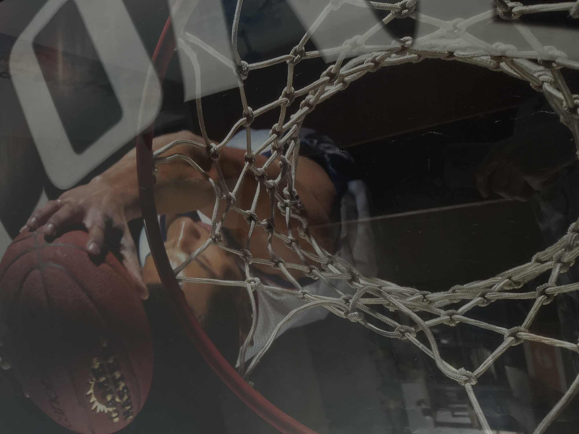 basketball hoop with a white net, a red rim, and a brown basketball held by a person's hand. In the background, there is a partial view of a person wearing a white tank top or jersey. An opaque shape, likely part of a logo or sign, overlays the scene. The location cannot be determined based on the image content.