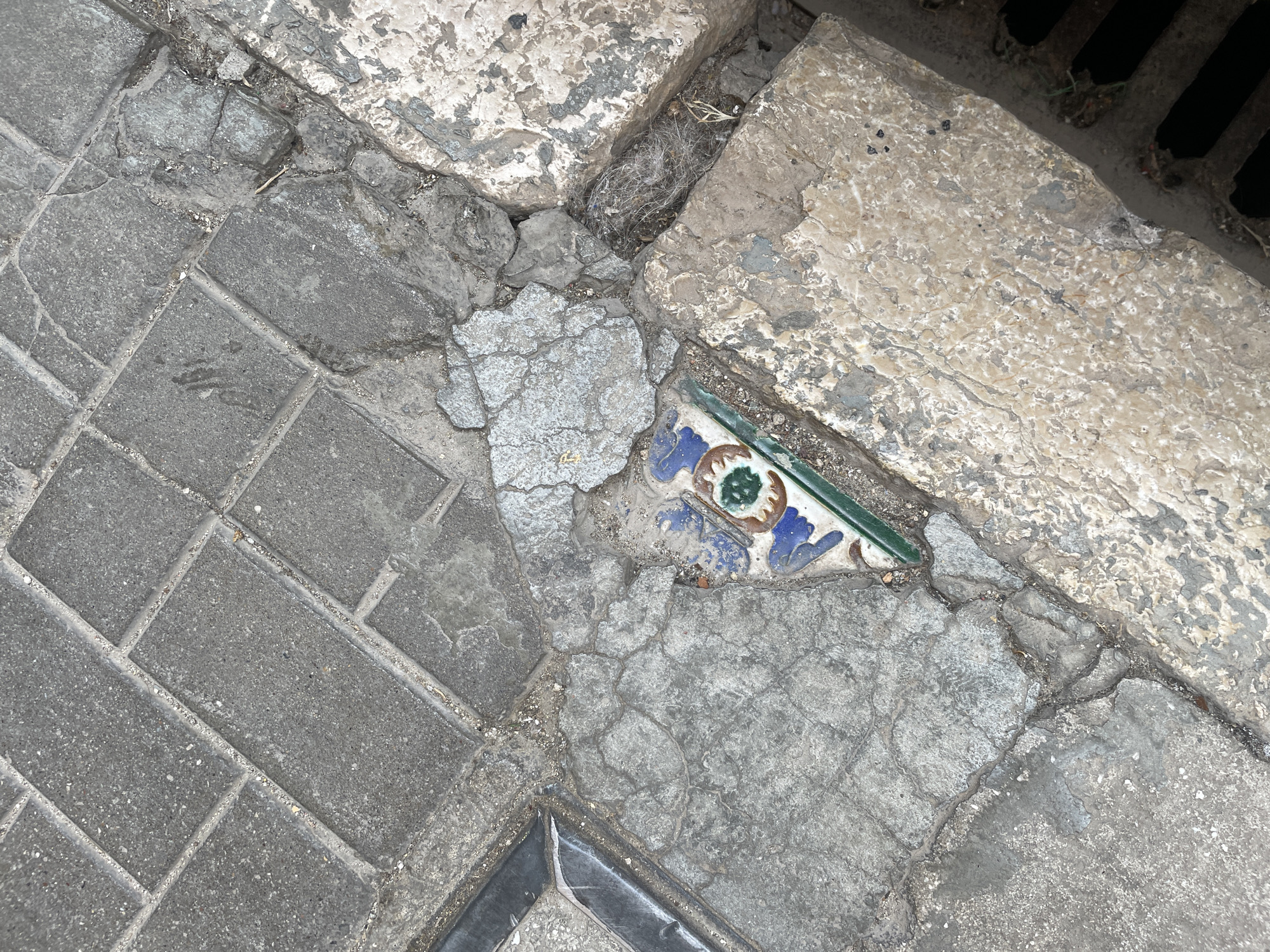 The image displays an overhead view of a section of aged and damaged pavement in Málaga, Spain. The ground surface is composed of disparate materials: grey rectangular pavers arranged in a partial herringbone pattern in the upper-left quadrant; large, worn, light-colored stone slabs, possibly marble or limestone, dominate the lower-right; and a central area of cracked, irregularly textured grey concrete. Embedded within this cracked concrete, slightly right of center, is a fragmented traditional ceramic tile. The visible portion of the tile features a green lower border, a central brown and green rosette-like motif, and stylized blue floral patterns extending upwards. The pavement exhibits significant wear and deterioration, characterized by extensive cracking, erosion, and minor debris such as small stones and fibrous organic material concentrated within crevices. A dark, metallic grate, likely part of a street drain, is partially visible in the bottom-right corner. No individuals or discernible actions are depicted.
