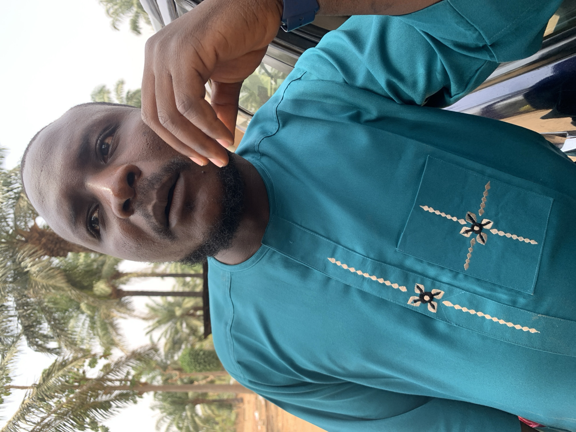 The scene, located outdoors in Washo, Nigeria, depicts a dark-complexioned adult male from the chest up. He has short hair and a trimmed beard, with his gaze directed upwards and to the right. His right hand is raised, with fingers curled, resting near his chin. He wears a teal long-sleeved garment featuring a round neck and a vertical embroidered placket with light-colored dashed lines and black-and-light-toned four-petal floral motifs. A left breast pocket also displays similar floral embroidery. A dark blue wristband is visible on his left wrist. The individual leans against a dark, reflective vehicle, partially visible on the right. The background consists of numerous tall palm trees and light-colored ground under a bright sky.