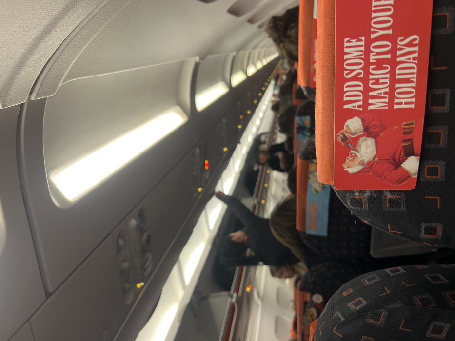 An airplane cabin with rows of passengers seated. Overhead lights illuminate the ceiling. A red tag attached to a seat shows Santa Claus drinking a Coca-Cola, with the text "Add Some Magic To Your Holidays." Some passengers are visible in the aisle, and a few overhead compartments are open.