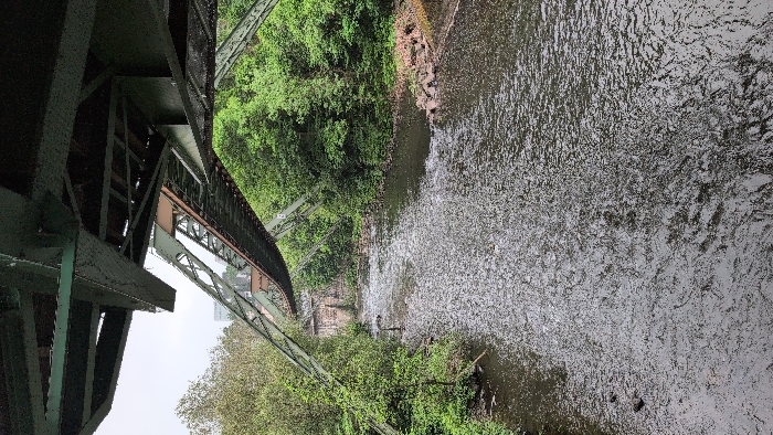view of the Wupper River in Wuppertal, Germany. The image is taken from the underside of the Wuppertal Schwebebahn, a suspension railway. The river is calm and flowing smoothly. Green trees line the banks of the river. The Schwebebahn is visible in the background, with its steel structure and tracks. There are no people or animals visible in the image. The image is taken during the day, with cloudy skies. The coordinates provided place the image near the Wupper River in Wuppertal, Germany. The Schwebebahn is a major landmark in the city. The image captures the serene beauty of the river and its surroundings.