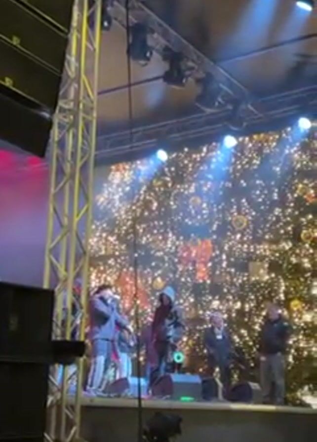 On an outdoor stage, illuminated by spotlights, a group of people are visible, including a man rapping into a microphone. He wears a dark jacket with a hood, and patterned pants. Behind them is a large Christmas tree adorned with lights and ornaments, filling the background. Stage equipment such as speakers and metal scaffolding is visible on either side of the stage. Several other people stand on the stage, some of whom appear to be security personnel. The atmosphere seems festive, likely associated with a Christmas event.