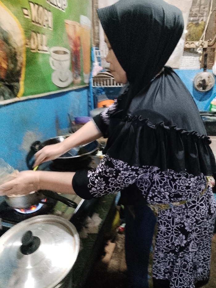 A woman wearing a black hijab and a dark floral-patterned dress is cooking. She's standing over a stove with a lit burner, pouring something from a clear container into a small pot. A pan sits on a neighboring burner. A lid rests on the side. A green sign with coffee-related graphics hangs in the background. The kitchen area appears to be a modest, possibly outdoor, setting.