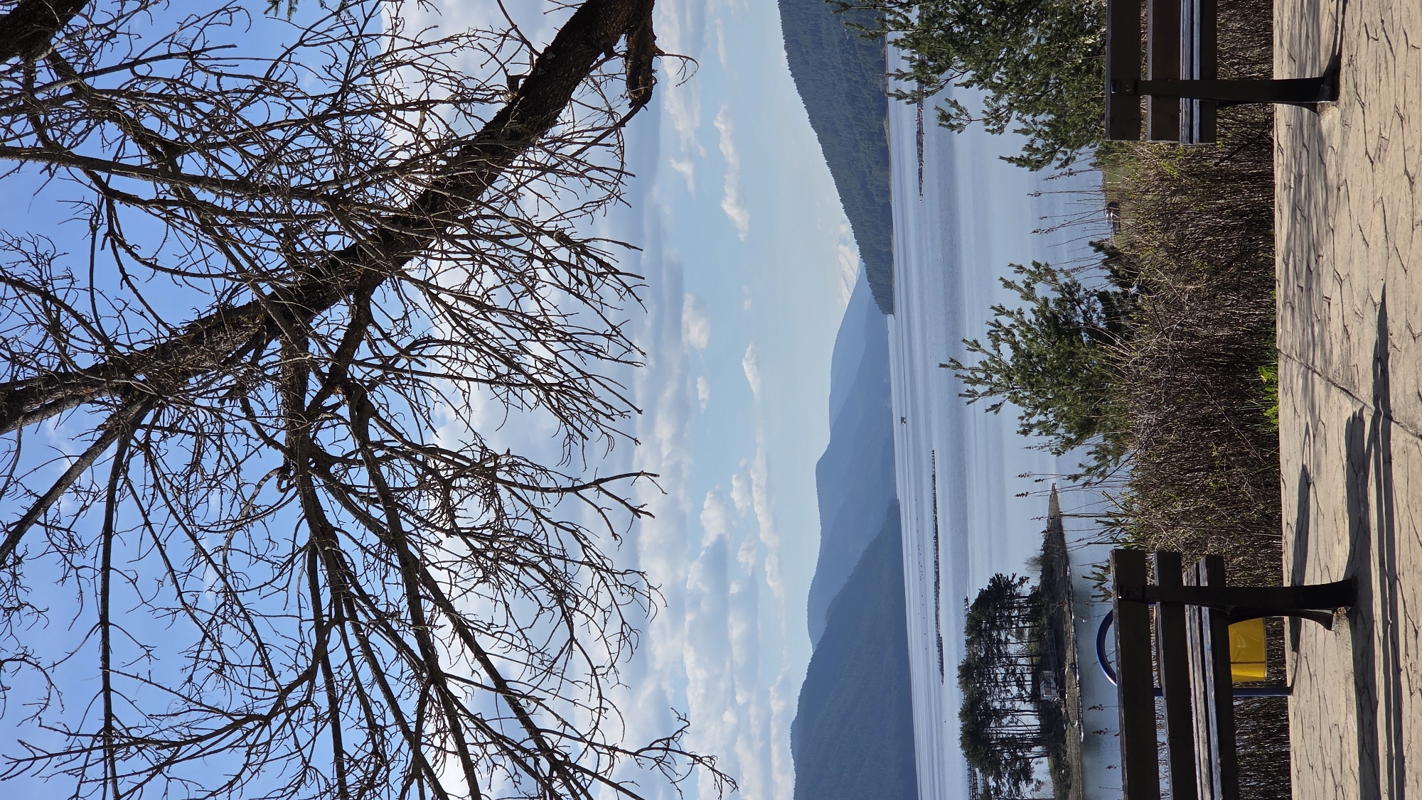 View from a lakeside promenade in Dospat, Bulgaria, featuring a leafless tree branch against a blue sky with scattered clouds in the left foreground