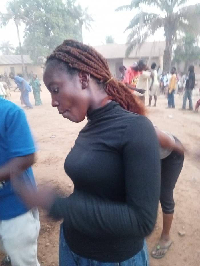 A woman with reddish-brown braided hair stands in a dirt-covered outdoor space. She wears a black turtleneck long-sleeve shirt and blue jeans. Behind her, a crowd of people is visible, along with a few buildings and tall trees. Another individual, wearing gray cropped leggings and green flip-flops, is partially visible to her right. Someone in a blue shirt and beige pants stands in the foreground to her left.