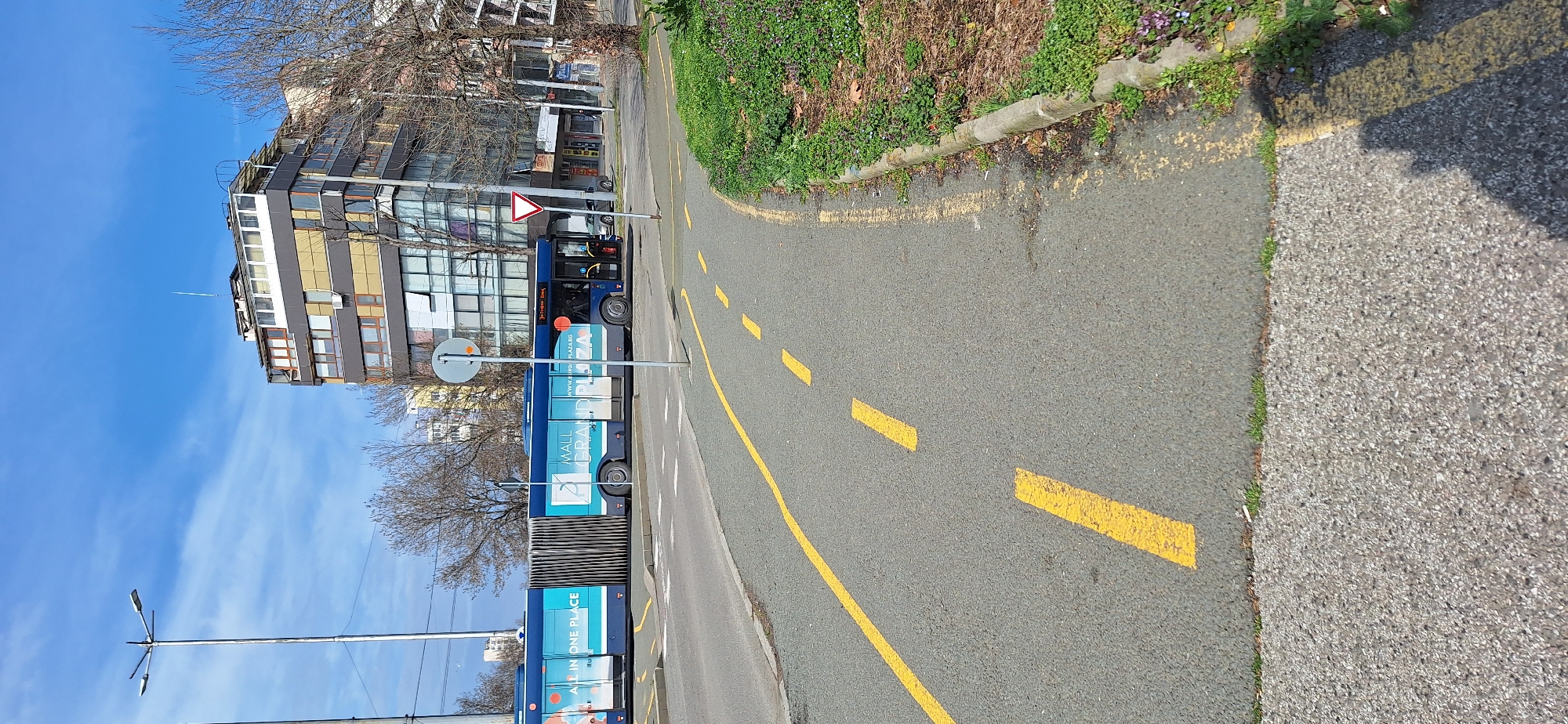 The image depicts a street scene in Burgas, Bulgaria. A blue public bus with advertisements for "Mall Grand Plaza" is stationary on the road. Yellow painted lines mark lanes and the roadside. Adjacent to the road is a curb with grassy vegetation. A multi-story building stands alongside the road. Traffic signs are visible near the bus. The sky is blue with scattered clouds. A light pole is visible in the foreground.