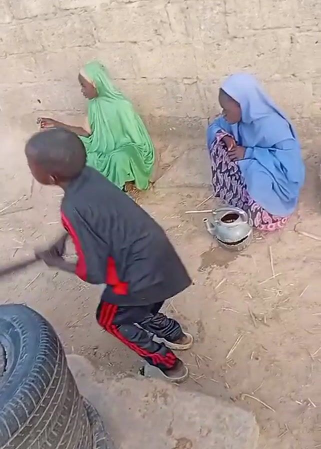 A young boy operates a water pump. The water pump is mounted on a pile of old tires. Three plastic buckets fill with water as he works the pump handle, standing on a stone. Two young girls in hijabs watch nearby. One is dressed in a light green hijab and the other in a blue one. A small pot sits beside the girl in the blue hijab. The boy is wearing a black tracksuit with a red stripe. A brick wall forms a backdrop to the scene.