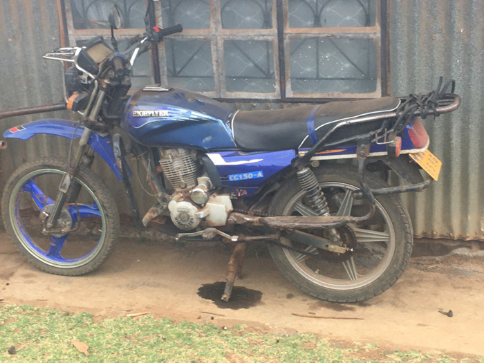 A blue "SHORYTEK CG150-A" motorcycle is parked on its side stand on a dirt patch in Ndeiya, Kenya